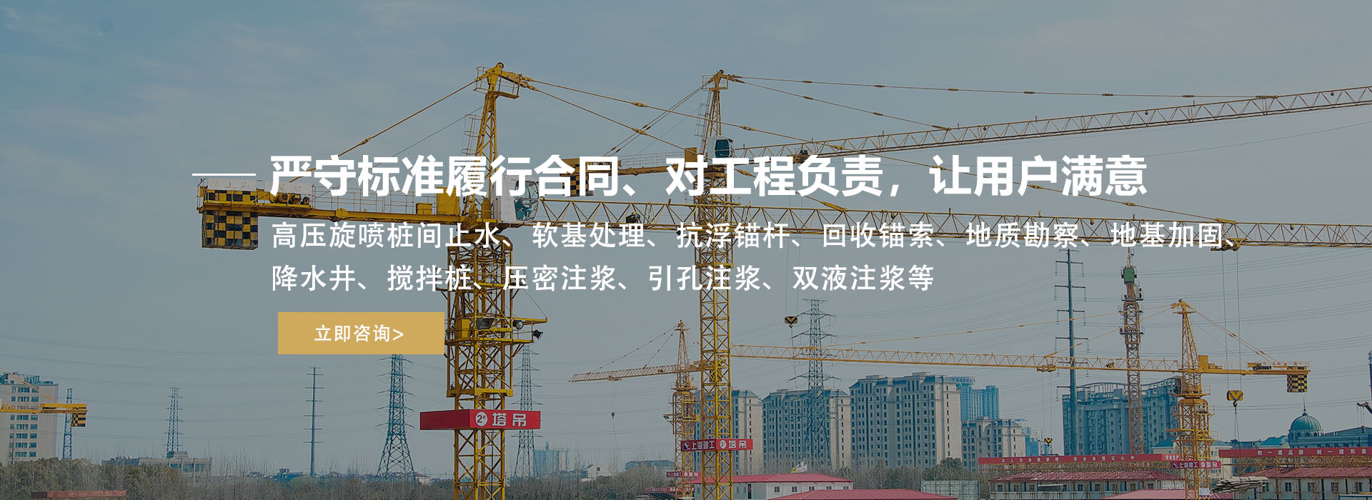 公司主營:高壓旋噴樁間止水、軟基處理、抗浮錨桿、回收錨索、地質(zhì)勘察、地基加固、降水井、攪拌樁、壓密注漿、引孔注漿、雙液注漿等,公司規(guī)模龐大,不斷超越、追求完美,誠信為本、創(chuàng)新為貌、嚴(yán)守標(biāo)準(zhǔn)履行合同,工程優(yōu)質(zhì)、信譽至上,對工程負(fù)責(zé),讓用戶滿意。